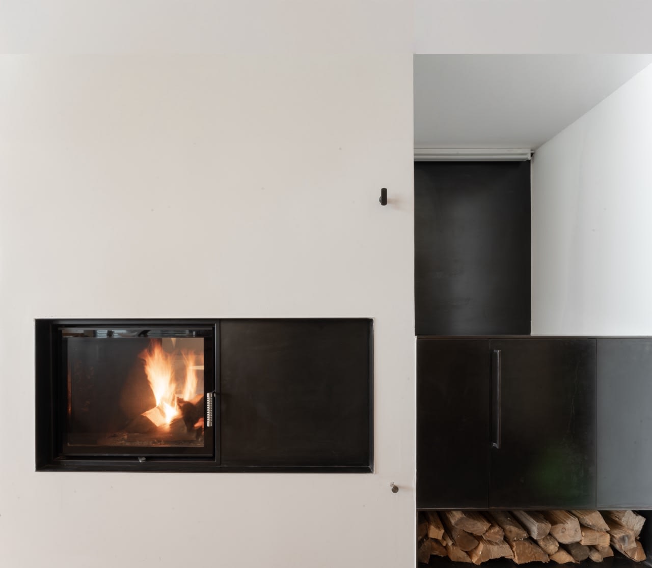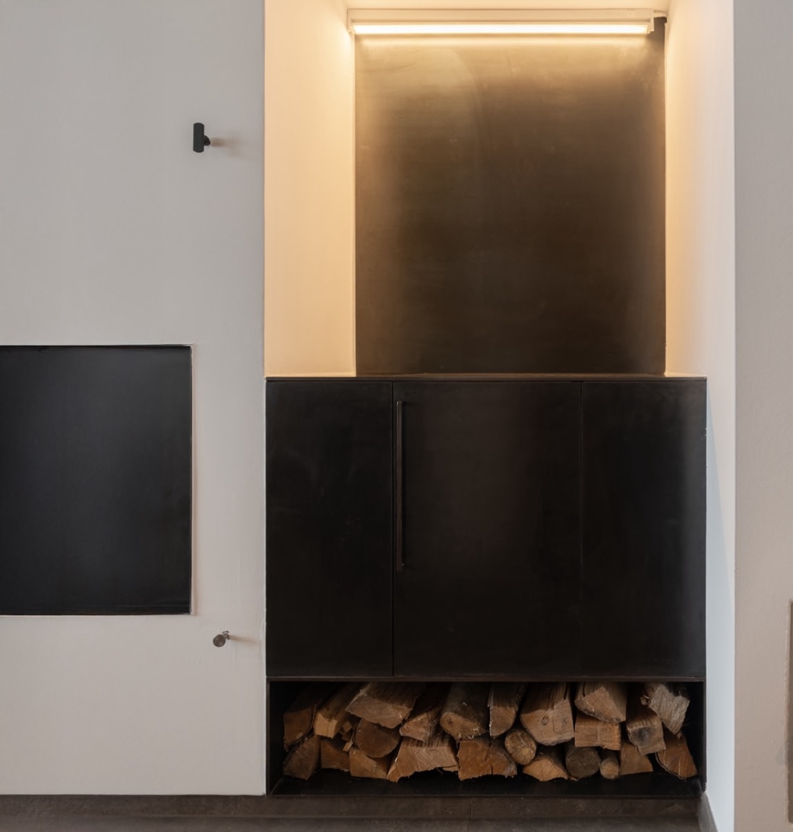 Dieser Grundofen wurde händisch gemauert und mit einem Tunnelfenster ausgestattet. Der Raumteiler-Ofen wird mit einem maßgeschneiderten Herd zum Kochen aus Rohstahl verbunden.